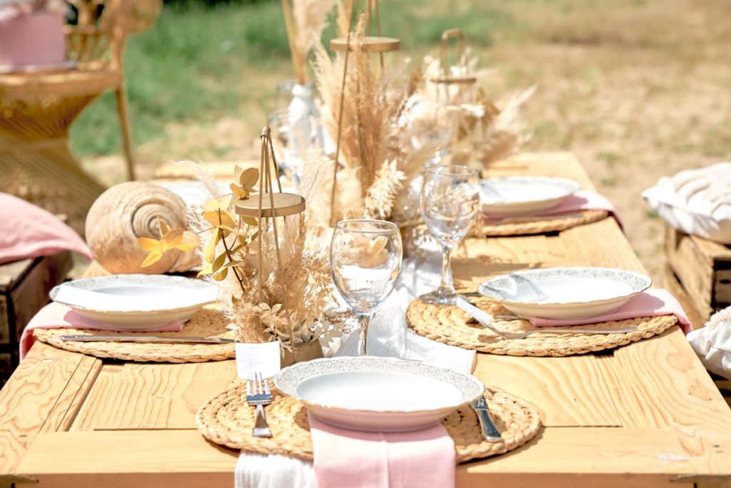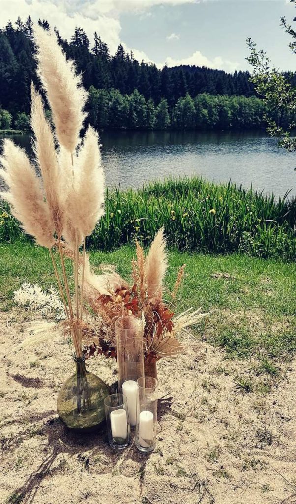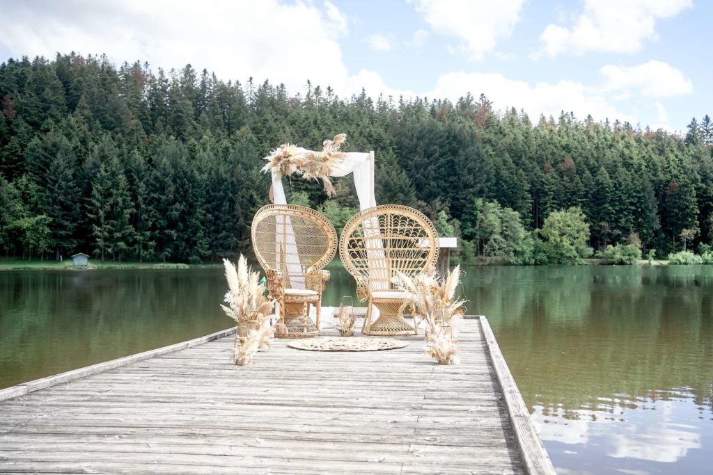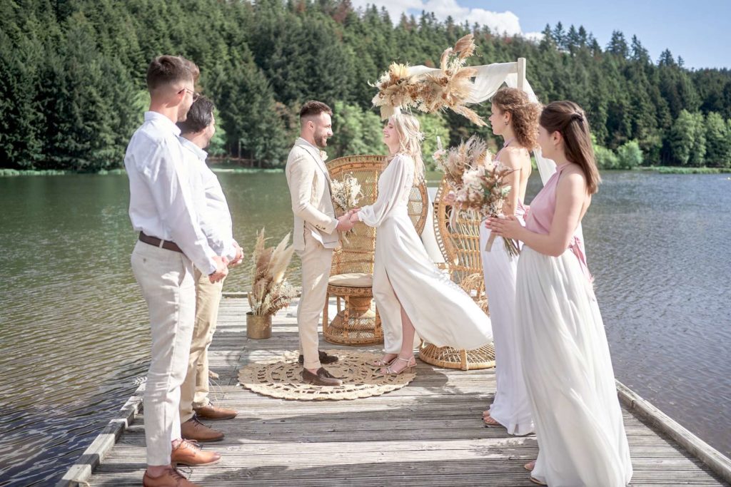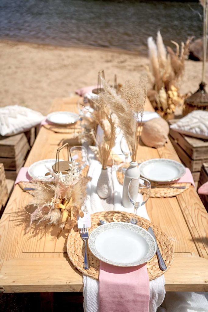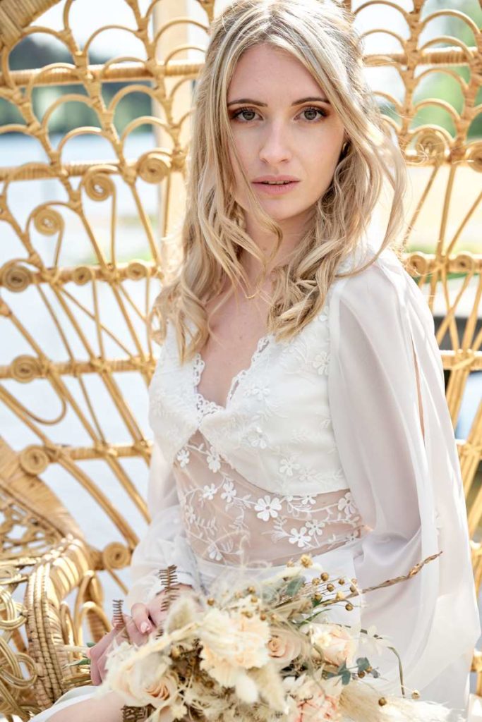 Thème du shooting photo : Se dire « OUI » sur une plage au bord d’un lac dans une ambiance et décoration de mariage bohème…